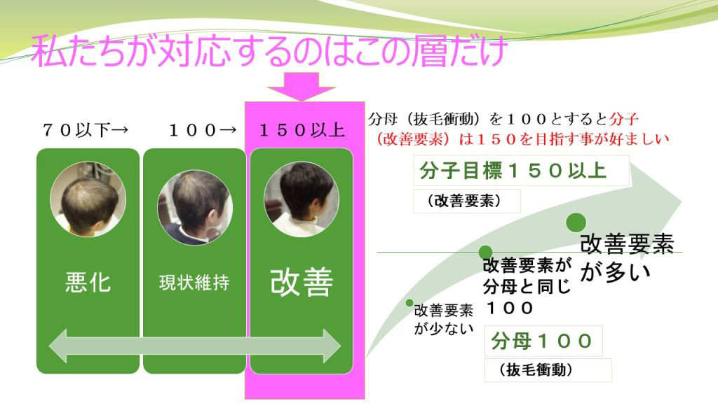- 延べ人数4000名以上の抜毛症の方から得たデータに基づき高確率で改善するための的確な対応が可能